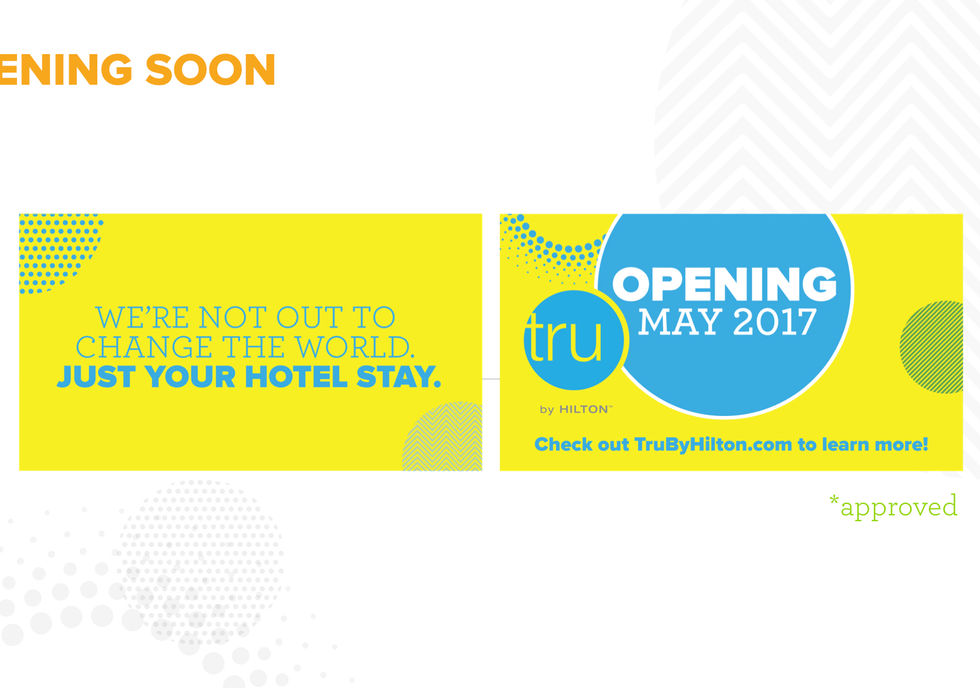 After leading the art direction and execution of the Tru By Hilton presentation, TMA won their new business and I was recruited to join the Tru By Hilton account. I helped contribute to their first store's grand opening concepts, their existing onsite hotel creative, marketing messaging & visuals, and social media creative. I've included some of the early stage Creative Campaign Concepts that I presented to the client in the link below.